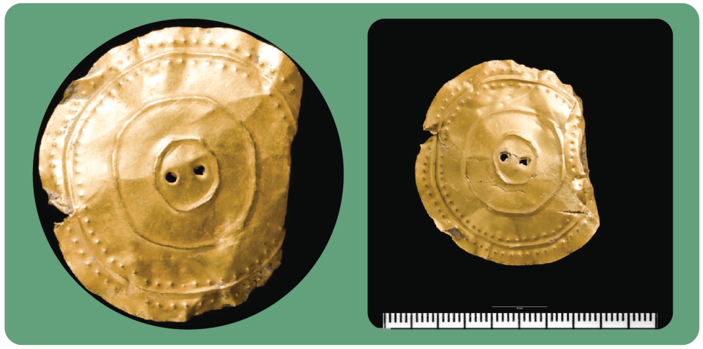 The item is within the collections at Amgueddfa Cymru and is on display at the St Fagans site. This record has lovely images of the disc and basic information about the discovery. https://museum.wales/collections/online/object/e47ada84-1b31-30bc-8888-4e92bf5ef245/Early-Bronze-Age-gold-disc/