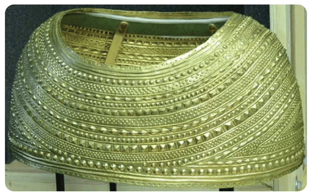 This spectacular gold cape is one of the most famous Welsh archaeological artefacts. It was found in a grave beneath a stone cairn and was discovered in 1833 when workmen were taking the stone for road construction. A second burial – this time a cremation in an urn was also found within the cairn.